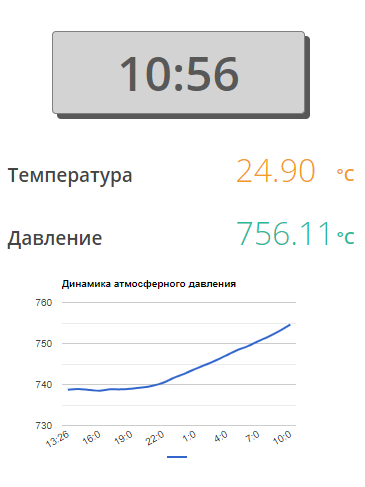 График атмосферного давления будет выглядеть так, как показано на картинке. Для построения графика используем замечательную библиотеку google charts.