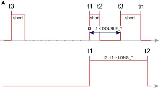 t2 — t1 — длительность нажатия. Вычисляем разность и определяем «длинное» или «короткое». t3 — t1 — длительность между нажатиями. Если менее порога, то «двойное».